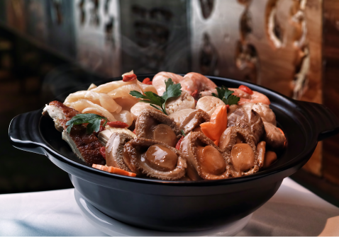 鮑魚花膠一品盆菜: 五頭南非鮑魚,八頭花膠,富貴金蠔,鵝掌,日本宗谷元貝,海中蝦,日本天白菇等多種佳餚。